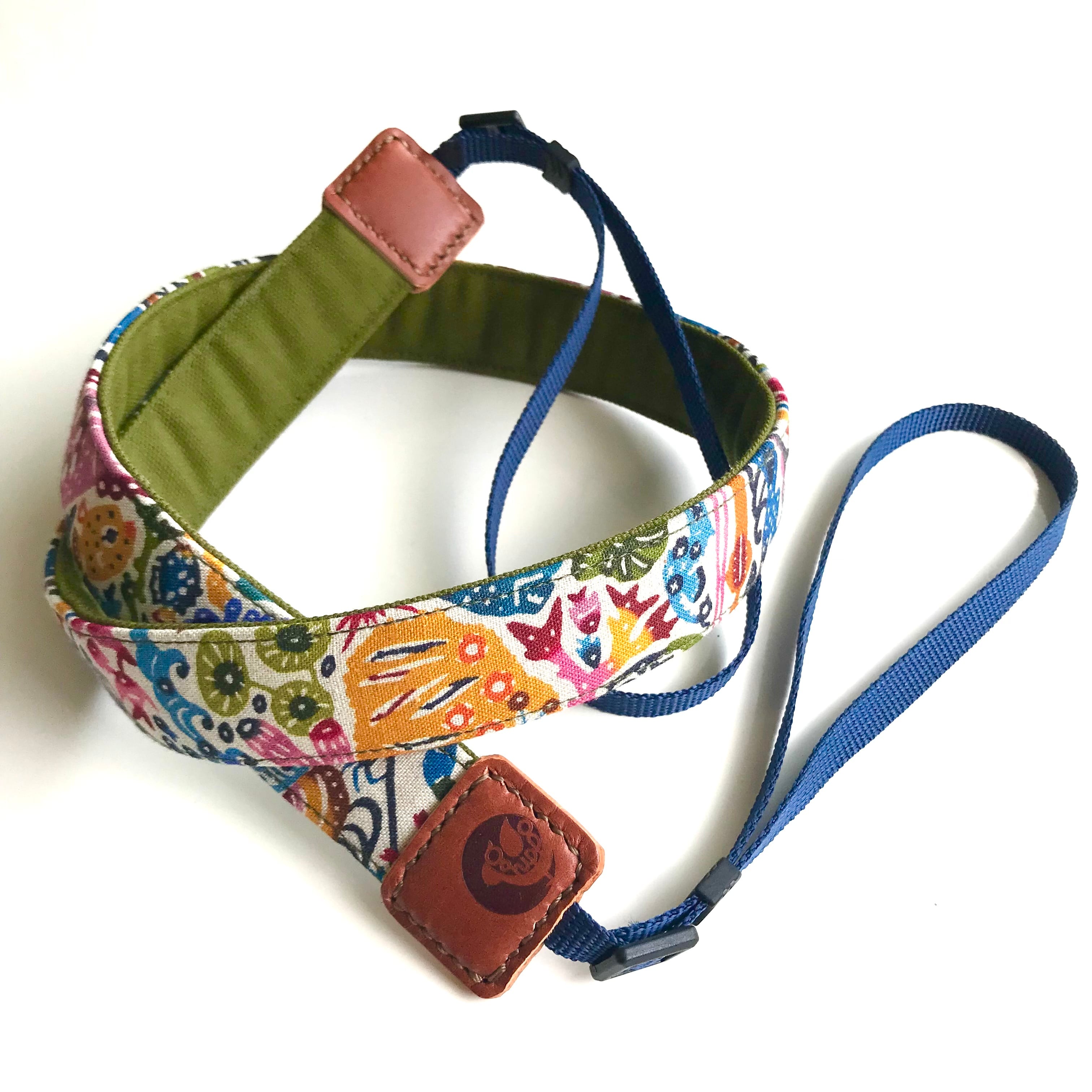 gruppoオリジナルの綿麻生地+無地のオックス生地+本革を使い製作した3cm巾のカメラストラップです。